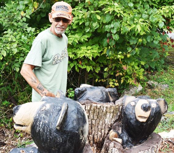 James Holt is utilizing a trimming tool to make workmanship out of tree stumps at Jay's Boat Moor on Boone Lake.
